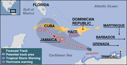 ہسپتالوں کو الرٹ پر رکھا گیا تھا اور سکولوں، دکانوں اور ہوائی اڈوں کو بند کردیا گیا تھا۔ حکومت نے لوگوں کے لئے ہنگامی قیام گاہیں قائم کی ہیں۔ حکومت نے کہا ہے کہ اگر لوگوں نے لوٹ مار کی تو حالات پر قابو پانے کے لئے فوج اور پولیس کا استعمال کیا جائے گا۔ گزشتہ سولہ برسوں میں جمائکہ میں آنیوالا یہ پہلا سمندری طوفان ہے اور نامہ نگاروں کا کہنا ہے کہ نصف صدی میں اس سے خطرناک طوفان یہاں نہیں آیا۔ جمائکہ کے بعد یہ طوفان کیوبا اور امریکہ کی جانب بڑھے گا۔ امریکہ کی ساحلی ریاست فلوریڈا میں لوگوں کو محفوظ مقامات پر پہنچایا جارہا ہے۔ ریاست فلوریڈا میں گزشتہ ماہ دو شدید سمندری طوفان آئے تھے جس کی وجہ سے کافی تباہی پھیل گئی تھی۔ وینیزوئیلا، ڈومینیکن ریپبلک میں پیر کے طوفان کی وجہ سے کئی لوگ مارے گئے ہیں جبکہ اس سے زیادہ تباہی گرینیڈا میں ہوئی جہاں دارالحکومت کِنگسٹن میں اس کی رفتار دو سو کیلومیٹر فی گھنٹے تھی اور شہر کے ہنگامی مرکز، مرکزی جیل، اور ہسپتال تباہ ہوگئے۔ برطانوی بحریہ متاثرہ لوگوں کی مدد کر رہی ہے۔ گرینیڈا کے وزیراعظم کیتھ میشیل نے جن کی سرکاری رہائش گاہ تباہ ہوگئی، کہا ہے کہ یہ جزیرہ نوے فیصدی تباہ ہوگیا ہے اور انہوں نے اسے قومی المیہ قرار دیا ہے۔ وزیراعظم میشیل اس وقت ایک برطانوی بحریہ کے جہاز پر پناہ لیے ہوئے ہیں۔ کنگسٹن میں واقع سترہویں صدی کی جیل سے قیدی فرار ہوگئے ہیں جن میں بائیں بازو کے وہ سیاست دان بھی ہیں جن کی وجہ سے امریکہ نے انیس سو تراسی میں گرینیڈا پر چڑھائی کردی تھی۔ ہر طرف لاقانونیت ہے اور وسیع پیمانے پر لوٹ کی اطلاعات ہیں۔