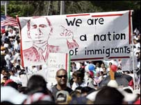 ’ اس ملک کے لیے آپ لوگوں کی خدمات کا بہت بہت شکریہ۔ اور اس بات کے لیے آپ کا شکریہ کہ آپ نے یہاں آ کر تمام ملک کے لوگوں کے ساتھ مل کر آج آواز اٹھائی ہے اور یہ مطالبہ کیا ہے کہ امریکی کانگرس امیگریشن قوانین میں تبدیلی کرے اور انہیں زیادہ منصفانہ بنائے‘۔ ہلیری کلنٹن نے یہ بھی کہا کہ امریکی ایوان نمائندگان یا ہاؤس آف ریپریزینٹیٹیو میں پیش کیا گیا بل نہ تو حقیقت کی نمائندگی کرتا ہے اور نہ امریکی اقدار کی۔ ہاؤس نے پچھلے سال کے اختتام پر جو بل پاس کیا تھا اس میں امریکہ میں غیر قانونی طور پر داخل ہونے والے کسی بھی شخص یا اس کی امداد کرنے والوں کو مجرم قرار دے دیا گیا تھا۔ نیو یارک کے ایک ڈیموکریٹ رکن کانگرس مین ہوزے سیرانو نے اس موقع پر خطاب کرتے ہوئے کہا کہ امریکہ تارکین وطن کا ملک ہے۔ جو لوگ یہاں سب سے پہلے آئے اورامریکہ کو بسایا، وہ بھی یہاں کاغذات لے کر نہیں آئے تھے۔ امریکہ میں دنیا کے ہر ملک سے لوگ آتے ہیں اور جنوبی ایشیا کو ملا کر دنیا کے بہت سے خطوں کے لوگ غیر قانونی طور پر یہاں موجود ہیں۔ تارکین وطن کی سب سے بڑی تعداد ہسپانوی ہے جو امریکہ اور میکسیکو کے درمیان 2000 میل لمبی سرحد کسی نہ کسی طرح پار کرکے یہاں داخل ہوتے ہیں۔ |