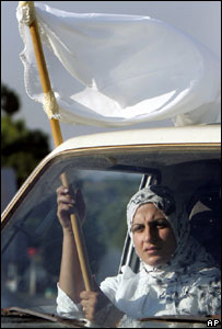 اسرائیلی حملوں سے بچنے کے لیے لوگوں نے سفید جھنڈے اٹھا رکھے تھے