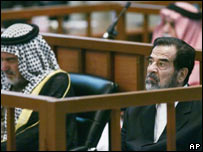 عراق کے سابق رہنما صدام حسین کو بھوک ہڑتال کے دوران صورتحال خراب ہونے پر ہسپتال میں داخل کرایا گیا ہے۔ صدام حسین پر ان دنوں عدالت میں مقدمہ چلایا جارہا ہے۔ حال میں ان کے وکیل کو گولی مارکر ہلاک کیے جانے کے بعد سابق عراقی رہنما بھوک ہڑتال پر تھے۔ صدام حسین کا مطالبہ ہے کہ ان کے وکیلوں کو سکیورٹی فراہم کی جائے۔ عدالت کے سرکاری وکیلوں نے بتایا ہے کہ صدام حسین گزشتہ دو ہفتے سے بھوک ہڑتال پر تھے۔ عدالت کے چیف پراسیکیورٹر جعفر الموساوی نے بتایا کہ پیر کے روز سماعت کے دوران صدام حسین عدالت میں موجود نہیں ہوں گے۔ اس مقدمے میں صدام حسین اور ان کے دیگر سات ساتھیوں پر انسانیت کے خلاف جرائم کے الزامات ہیں۔ انہوں نے ان الزامات سے انکار کیا ہے۔ صدام حسین کی قانونی ٹیم نے بتایا ہے کہ ان کے مؤکل اور سات دوسرے قیدیوں نے عہد کیا ہے کہ وہ اس وقت تک ہڑتال ختم نہیں کریں گے جب تک وکلاء صفائی کو بین الاقوامی سطح کا تحفظ فراہم نہیں کیا جاتا۔ | اسی بارے میں صدام مقدمہ: ’23 مقتول زندہ ہیں‘ 31 May, 2006 | آس پاس ’صدام حسین کو پھانسی دی جائے‘19 June, 2006 | آس پاس بغداد: صدام کے وکیلِ صفائی ہلاک21 June, 2006 | آس پاس صدام اور ساتھی بھوک ہڑتال پر21 June, 2006 | آس پاس صدام نے مقدمے کا بائیکاٹ کر دیا10 July, 2006 | آس پاس | ||||||||||||||||||||||||||||||||||||||||