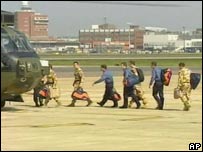 لندن سے اہلکاروں کو لے کر ایک ہیلی کاپٹر ڈیون میں واقع رائل میرین کے اڈے کے لیے روانہ ہوا ہے جہاں یہ افراد اپنے اپنے اہل خانہ سے ملیں گے۔
