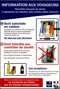 سنہ دو ہزار دو میں برطانوی پولیس کے اس دعوے کے بعد کہ امریکہ جانے والی پروازوں کو مائعات سے بنے ہوئے دھماکہ خیز مواد سے اڑانے کی سازش کی گئی ہے، جہازوں پر مسافروں کے دستی سامان میں مائعات کی مقدار پر پابندی لگا دی گئی تھی۔