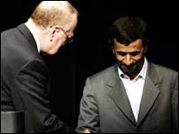 لی بولنگر نے اپنی تقریر میں ہولوکاسٹ کے بارے میں محمود احمد نژاد کے خیالات پر تبصرہ کرتے ہوئے کہا کہ یا تو وہ (ایران کے صدر) انتہائی اشتعال انگیزی پھیلا رہے ہیں یا وہ اس سلسلے میں حیران کن حد تک لاعلم ہیں۔ ایران کے صدر کے امریکہ پہنچنے پر امریکی ذرائع ابلاغ کی طرف سے منفی رویہ دیکھنے میں آیا ہے اور ایک امریکی جریدے نے ان کی آمد کو برائی کی آمد سے تعبیر کیا۔ نیویارک پوسٹ نے اس موقع پر ’پاگل آدمی ایران کا صدر‘ کی سرخی جمائی۔ احمدی نژاد ماضی میں اسرائیل کو صفحہ ہستی سے مٹانے اور ہولوکاسٹ کو افسانہ قرار دے چکے ہیں۔ کولمبیا یونیورسٹی میں ایران کے صدر کے خطاب کے ٹکٹ ایک گھنٹے کے اندر ہی بک گئے تھے۔ ایران کے صدر منگل کو جنرل اسمبلی سے خطاب کرنے والے ہیں۔ | اسی بارے میں شکوک کاخاتمہ: تجاویزایران کوقبول31 August, 2007 | آس پاس پاسدارانِ انقلاب کے سربراہ تبدیل02 September, 2007 | آس پاس ’ایران موقع کوہاتھ سے جانے نہ دے‘02 September, 2007 | آس پاس ’ایران نے اہم ایٹمی ہدف حاصل کر لیا‘02 September, 2007 | آس پاس دعویٰ یا حقیقت!03 September, 2007 | آس پاس ’حملہ آخری راستہ ہونا چاہیے‘18 September, 2007 | آس پاس احمدی نژاد،گراؤنڈ زیرو نہیں جاسکتے20 September, 2007 | آس پاس حملے سے باز رہیں: احمدی نژاد22 September, 2007 | آس پاس | ||||||||||||||||||||||||||||||||||||||||