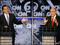 امریکہ کے صدارتی انتخابات کے لیے ریپبلکن پارٹی کا امیدوار بننے کے خواہشمند نیو یارک کے سابق مئر روڈی جولیانی اور ان کے ایک حریف مٹ رومنی نے امیگریشن کے مسئلے پرگرما گرم بحث میں حصہ لیا ہے جس کے لیے سوال عام لوگوں نے تجویزکیے تھے۔ مٹ رومنی نے سابق مئر پر الزام لگایا کہ غیر قانونی امیگریشن کے سوال پر ان کی پالیسی نرم ہے لیکن جواب میں روڈی جولیانی کا کہنا تھاکہ مٹ رومنی نے خود اپنے محل نما گھر میں غیر قانوی تارکین وطن سے کام لیا ہے۔ اس مباحثے میں آٹھ امیدوار شریک ہوئے جنہوں نے ویڈیو ویب سائٹ یو ٹیوب استعمال کرنے والوں کی جانب سے پوچھے گئے سوالوں کا جواب دیا۔ یہ بحث سی این این پر دکھائی گئی۔ صدر کے عہدے کے لیے پارٹی کے امیداوروں کے انتخاب میں اب صرف پینتیس دن باقی رہ گئے ہیں۔ قومی سطح پر تو مسٹر جولیانی آگے ہیں لیکن مٹ کو آئیووا اور نیو ہیمپ شر صوبوں میں سبقت حاصل ہے جہاں سب سے پہلے ووٹ ڈالے جائیں گے۔