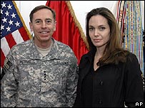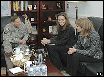 بغداد میں ہالی وڈ کی اداکارہ نے امریکی فوجیوں کے ساتھ دوپہر کا کھانا کھایا اور امریکی جنرل پیٹراؤس، سینئر سفارت کاروں اور عراق میں بے گھر ہونے والے افراد کی نگہبانی کرنے والے وزیر کے ساتھ بھی ملاقات کی۔