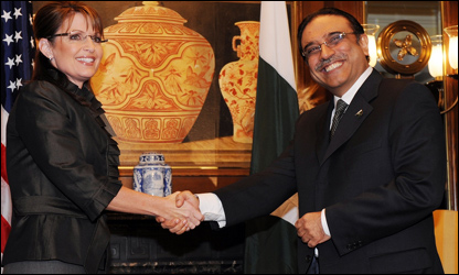 پاکستان کے صدر آصف زرداری نے امریکی نائب صدر کی امیدوار سارہ پیلن سے ملاقات میں کہا ہے کہ وہ انتہائی حسین ہیں اور انہیں دیکھنے