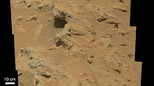 یہ اتفاق کی بات ہے کہ کیورسٹی چلتے چلتے ایک زبردست پتھر کے سامنے پہنچ گئی۔ یہ ایک دس سے پندرہ سنٹی میٹر موٹے پتھر کی ایک سل تھی جو زمین سے ایک زاویے سے اوپر اٹھی ہوئی تھی۔