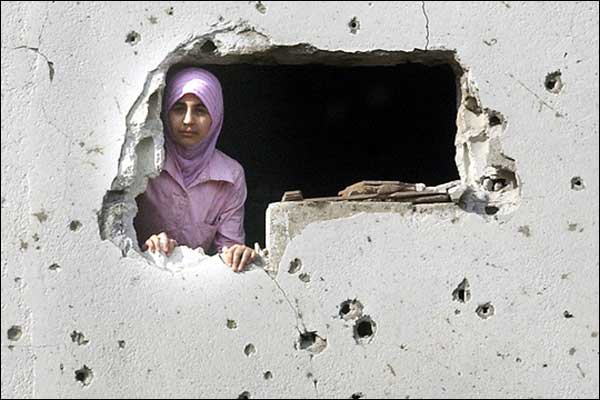 لبنان کے شہر سدون میں ایک لڑکی اسرائیلی حملوں میں تباہ ہونے والے اپنے گھر کی تباہ شدہ کھڑکی سے تباہی کا جائزہ لیتے ہوئے۔