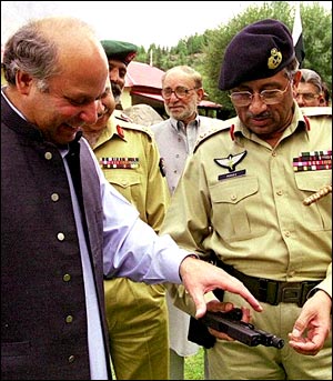 آرمی کے سربراہ جنرل پرویز مشرف جنہیں وزیرِ اعظم نواز شریف نے کئی دوسرے جنرلوں پر سبقت دیتے ہوئے ترقی دی تھی، وزیرِ اعظم کو ’ کارگل آپریشن‘ کے دوران بھارتی فوجیوں سے قبضے میں لی گئی ایک مشین گن دکھا رہے ہیں۔