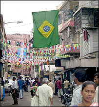 اگلی گلی میں ایک مصور فٹبال کے عالمی ستاروں کی ایک بڑی تصویر کو آخری ’ٹچ‘ دے رہا ہے۔ ایک ہجوم اس تصویر کو دیکھنے کے لیئے جمع ہے اور تب ہی چند ایسے بچوں کا گروہ جن کے چہروں پر برازیل کے جھنڈے بنے ہوئے ہیں، نعرے لگاتا ہے برازیل، برازیل ۔۔۔۔