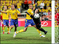 عالمی کپ فٹبال میں جرمنی کے شہر کلون میں انگلینڈ اور سویڈن کے درمیان میچ دو دو گول کی برابری پر ختم ہوگیا۔ پہلے راؤنڈ کے اس آخری میچ کے بعد انگلینڈ اپنے گروپ میں سرِ فہرست ہے۔ اس میچ میں انگلینڈ نے دو بار برتری حاصل کی لیکن سویڈن نے دونوں بار مقابلہ برابر کر دیا۔ انگلینڈ ناک آؤٹ راؤنڈ میں اپنے اگلا میچ ایکواڈور کے خلاف کھیلے گا۔ انگلینڈ اڑتیس سال کے دوران سویڈن نے کوئی میچ نہیں جیت سکا۔ انگلینڈ کی طرف سے جو کول نے کھیل کے تینتیسویں منٹ میں سکور کیا جسے میچ کے اکاونویں منٹ میں سویڈن نے برابر کر دیا۔ تاہم میچ کے چوراسویں منٹ میں انگلینڈ کے سٹیون جیراڈ نے انگلینڈ کی طرف سے دوسرا گول کر دیا۔ سویڈن نے کھیل کے آخری منٹ میں دوسرا گول کر کے مقابلہ ایک بار پھر برابر کر دیا۔ انگلینڈ کی ٹیم کو کھیل کی ابتدا میں اس وقت مشکل درپیش ہوئی جب اس کے سٹرائکر مائیکل اوون زخمی ہوگئے۔ انہیں گھٹنے پر چوٹ آئی ہے اور ان کی جگہ پیٹر کراؤچ آئے ہیں جنہیں گزشتہ میچوں میں پیلا کارڈ ملنے کی وجہ سے نہیں کھلایا جا رہا تھا کہ کہیں دوسرا پیلا کارڈ ملنے پر وہ اگلے میچ سے باہر نہ ہوجائیں۔ انگلینڈ کی طرف سے آج وائن رونی پہلی مرتبہ میچ کے شروع ہی میں میدان میں ہیں۔ کھیل کےشروع میں سویڈن کی ٹیم نے انگلینڈ کے خلاف دباؤ بڑھایا تھا مگر وہ گول کرنے میں کامیاب نہ ہو سکی۔ انگلینڈ کے کوچ نے میچ کے بعد اس امکان کو رد نہیں کیا کہ مائیکل اوون شاید اس عالمی کپ میں نہ کھیل سکیں۔ تاہم انہوں نے کہا کہ اس کا فیصلہ طبی رپورٹوں کے بعد ہوگا۔ انہوں نے کہا کہ انگلینڈ نے دفاعی کھیل میں کچھ کمزوریاں دکھائیں۔ اس سے قبل عالمی میزبان ٹیم جرمنی نے جنوبی امریکہ کے ملک ایکواڈور کو تین گول سے ہرا دیا۔ میچ کی رفتار پہلے ہی منٹ سے تیز اور سنسنی خیز رہی۔ تیسرے منٹ میں جرمنی کے میرولاو کلوس نے گول کیا۔ 42ویں منٹ میں کلوس نے مائکل بیلیک کے پاس پر ایک اور گول کر دیا۔ ہاف ٹائم تک سکور دو۔صفر تھا لیکن پھر 52ویں منٹ میں جرمنی کے لُوکس پودولوسکی نے تیسرا گول کر دیا۔