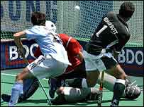 ارجنٹائن کے خلاف میچ میں پاکستان کی طرف سے پہلے دو گول ریحان بٹ نے کیئے جبکہ تیسرا گول دوسرے ہاف میں سہیل عباس نے پینلٹی کارنر پر کیا۔ پہلا گول ارجنٹینا کے دفاعی کھلاڑیوں کی غلطی کی بدولت ہوا جبکہ ریحان بٹ نے دوسرا گول عدنان ذاکر کے ایک کراس پر کیا۔ ارجنٹینا کا واحد گول ماریو المادہ نے پنلٹی کارنر پر کیا۔ پاکستان نے اپنے آخری گروپ میچ میں بھی ارجنٹینا کو ایک کے مقابلے میں دو گول سے شکست دی تھی۔