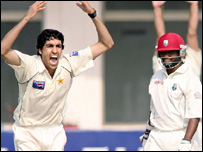 دانش کنیریا براوو کو یونس خان کی مدد سے پویلین کی راہ دکھانے میں کامیاب ہوگئے۔ انہوں نے بارہ چوکوں کی مدد سے89 رنز بنائے۔ لارا اور براوو نے پانچویں وکٹ کی شراکت میں200 رنز کا اضافہ کیا جو پاکستان کے خلاف ویسٹ انڈیز کی ریکارڈ شراکت ہے اس سے قبل58-1957 کے برج ٹاؤن ٹیسٹ میں کولی اسمتھ اور ایورٹن ویکس نے پانچویں وکٹ کے لئے185 رنز بنائے تھے۔ پاکستانی بولرز میں کنیریا159 رنز کے عوض تین وکٹوں کے ساتھ سب سے کامیاب رہے۔ پاکستانی ٹیم نے پہلی اننگز میں 357 رنز پر آؤٹ ہوگئی تھی۔ پہلے دن کے کھیل کے اختتام پر پاکستان نے چار کھلاڑیوں کے نقصان پر 263 بنائے تھے۔کھیل کے دوسرے روز دوسرے پاکستان کی پاکستان نے کپتان انضمام الحق، شیعب ملک ، عبدالرزاق، کامران اکمل سمیت چھ وکٹیں صرف چھیانوے رنز کے اضافہ پر کھو دیں۔ پاکستانی ٹیم: انضمام الحق، محمد یوسف، عمران فرحت، محمد حفیظ، یونس خان، شعیب ملک، عبدالرزاق، کامران اکمل، شاہد نذیر، عمر گُل اور دانش کنیریا۔ ویسٹ انڈیز کی ٹیم برائن لارا، ڈیرن گنگا، کرس گیل، رناکو مارٹن، شِو نرائن چندرپال، ڈوائن براوو، دنیش رام دین، ڈیو محمد، کوری کالیمور، ڈیرن پاول اور جیروم ٹیلر۔ | اسی بارے میں ملتان ٹیسٹ: 263 پر چار آؤٹ19 November, 2006 | کھیل ڈوپنگ اپیلیں، سماعت ملتوی16 November, 2006 | کھیل طلباء کا نیا کرکٹ ریکارڈ 16 November, 2006 | کھیل چھ دن کا ٹیسٹ کریں: انضمام15 November, 2006 | کھیل بورڈ اثرانداز نہیں ہوسکتا: فخرالدین15 November, 2006 | کھیل پاکستان کی نو وکٹوں سے کامیابی14 November, 2006 | کھیل | ||||||||||||||||||||||||||||||||||||||||