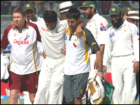 ویسٹ انڈیز کو دوسرا نقصان اس وقت اٹھانا پڑا جب دوسری جانب سے بالنگ کراتے ہوئے شاہد نذیر نے ویسٹ انڈیز کے دوسرے اوپنرڈیرن گنگا کو ایل بی ڈبلیو کر دیا۔ اس سے قبل پاکستان نے اپنی دوسری اننگز 399 رنز چھ کھلاڑی آؤٹ پر ختم کر کے ویسٹ انڈیز کو جیتنے کے لیے 444 رنز کا ہدف دیا تھا۔ کراچی ٹیسٹ کے چوتھے دن کی خاص بات محمد یوسف کا ایک سال کے اندر نو سینچریاں بنانے کا نیاعالمی ریکارڈ قائم کرنا تھا۔ اس طرح انہوں نے اسی میچ کی پہلی اننگز میں آٹھ سینچریوں کو اپنا ہی بنایا ہوا ریکارڈ میچ کی دوسری اننگز میں مزید بہتر کر دیا۔ اس سے قبل چوتھے دن محمد یوسف نے ویسٹ انڈیز کے ویوین رچرڈز کا ایک سال میں سب سے زیادہ رنز سکور کرنے کا ریکارڈ اس وقت توڑ دیا جب انہوں نے اپنی اننگز میں سینتالیس رنز کا ہدف عبور کیا۔ ویوین رچرڈز نے سب سے زیادہ سکور کرنے کا ریکارڈ 1976 میں 1710 رنز بنا کر قائم کیا تھا۔ چوتھے دن کا آغاز گزشتہ روزکے ناٹ آؤٹ کھلاڑیوں اوپنر محمد حفیظ اور محمد یوسف نے کیا۔ دونوں کھلاڑیوں نے عمدہ بیٹنگ کا مظاہرے کرتے ہوئے تیسری وکٹ کی شراکت میں 149 رنز کا اضافہ کیا۔ پاکستانی ٹیم: انضمام الحق، محمد یوسف، عمران فرحت، محمد حفیظ، یونس خان، شعیب ملک، عبدالرزاق، کامران اکمل، شاہد نذیر، عمر گُل اور دانش کنیریا۔ ویسٹ انڈیز کی ٹیم برائن لارا، ڈیرن گنگا، کرس گیل، رناکو مارٹن، شِو نرائن چندرپال، ڈوائن براوو، دنیش رام دین، ڈیو محمد، کوری کالیمور، ڈیرن پاول اور جیروم ٹیلر۔ | اسی بارے میں کراچی: بڑے سکور کی کوشش29 November, 2006 | کھیل ویسٹ انڈیز کے چھ کھلاڑی آؤٹ28 November, 2006 | کھیل پاکستان بمقابلہ ویسٹ انڈیز: سکور کارڈ19 November, 2006 | کھیل ویسٹ انڈین کرکٹ کو ’زوال‘20 November, 2006 | کھیل گیل اور گنگا کے سامنے بولرز بے بس20 November, 2006 | کھیل لارا کی سنچری، ویسٹ انڈیز آگے21 November, 2006 | کھیل ایشیز: رِکی پونٹنگ کی سینچری23 November, 2006 | کھیل ملتان: پاکستان نے ٹیسٹ بچالیا23 November, 2006 | کھیل | ||||||||||||||||||||||||||||||||||||||||