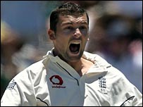 کپتان فلنٹوف نے اننگز کے آغاز میں ہارمسن کو بولنگ کرنے کا موقع نہیں دیا، تاہم ہوگارڈ کے ہٹائے جانے کے بعد جب انہوں نے بولنگ کا آغاز کیا تو آسٹریلوی بلے بازوں کو شدید مشکل میں ڈال دیا۔ آسٹریلیا کے دوسری وکٹ 54 رنز پر گری جس کے بعد سوائے مائیک ہسے اور کلارک کے کوئی بھی آسٹریلوی کھلاڑی جم کر نہ کھیل سکا۔ جب مونٹی پانیسر پہلی مرتبہ ایشز میں بولنگ کرانے آئے تو تماشائیوں نے ان کا زبردست خیر مقدم کیا۔ ان کا پہلا اوور میڈن رہا لیکن ایشز میں پہلی وکٹ لینے میں انہیں زیادہ دیرنہیں کیونکہ اپنے دوسرے اوور کی پہلی ہی گیند پر انہوں نے لینگر کو بولڈ کر دیا۔ اس موقع پر ہسے اور کلارک نے آسٹریلیا کو مشکل سے نکالا اور چوتھی وکٹ کی شراکت میں 51 رنز کا اضافہ کیا لیکن ہارمسن کے ہاتھوں کلارک کے آؤٹ ہونے کے بعد مونٹی پانیسر اور ہارمسن کو روکنے والا کوئی نہیں تھا۔ | اسی بارے میں آسٹریلیا کا انگلینڈ کو بھرپور جواب 04 December, 2006 | کھیل انگلینڈ کی حیران کن شکست05 December, 2006 | کھیل پہلے ٹیسٹ میں آسٹریلیا کی جیت27 November, 2006 | کھیل ایشز: انگلینڈ کو پہلی کامیابی02 December, 2006 | کھیل | ||||||||||||||||||||||||||||||||||||||||
