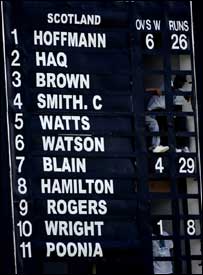 ان کے علاوہ شین واٹسن اور ہوگ نے آخری چار اوورز میں سکاٹ لینڈ کے بولروں کی خوب پٹائی کی اور بالاترتیب 18 اور چالیس رنز بنائے۔ آسٹریلیا کی طرف سے اوپننگ پیتھیو ہیڈن اور ایڈم گلکرسٹ نے اور ایک اچھا آغاز دیا۔ آسٹریلیا کی پہلی وکٹ 91 کے سکور پر گری جب گلکرسٹ براؤن کی گیند پر ایل بی ڈبلیو آؤٹ ہوئے۔ انہوں نے 46 رنز بنائے۔ دوسرے آؤٹ ہونے والے کھلاڑی میتھیو ہیڈن جو 60 رنز بنا کر آؤٹ ہوئے۔ انہیں ماجد حق نے آؤٹ کیا۔ ماجد نے ہی تیسری وکٹ لی جو مائیکل کلارک کی تھی جو 15 رنز بنا کر آؤٹ ہوئے۔ ہوج 29 رنز بنا کر اور ہسی چار رنز بنا کر آؤٹ ہوئے۔ اس سے قبل سکاٹ لینڈ نے ٹاس جیت کر آسٹریلیا کو پہلے کھیلنے کی دعوت دی اور آسٹریلیا کی طرف سے ایڈم گلکرسٹ اور میتھیو ہیڈن نے اوپنگ کی۔ آسٹریلیا مسلسل تیسری مرتبہ ورلڈ کپ جیتنے کی کوشش میں ہے لیکن اس سے قبل پانچ ایک روزہ میچوں میں اسے مستقل شکست کا سامنا رہا ہے۔ اور اگر سکاٹس نے کسی طرح پانسہ پلٹ دیا تو یہ شاید ورلڈ کپ کی تاریخ کا سب سے بڑا اپ سٹ ہو گا۔ اور سکاٹ لینڈ کے کوچ پیٹر ڈرنن کا بھی خیال ہے کہ کرکٹ میں ’کچھ بھی ہو سکتا ہے۔ اگر ہم صحیح کھیلے تو ہم بہت خطرناک ہو سکتے ہیں، آسٹریلیا کے خلاف بھی۔‘