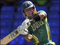 ڈی ویلیئرز کے علاوہ جنوبی افریقہ کے ہر بیٹسمین نے پچاس سے زائد سکور کیا۔ ژاک کیلیس نے 109 گیندوں پر گیارہ چوکوں اور پانچ چھکوں کی مدد سے 128 رنز بنائے۔ان کے ساتھ باؤچر نے 75 رنز بنائے اور آؤٹ نہیں ہوئے۔ جنوبی افریقہ کے آخری آؤٹ ہونے والے کھلاڑی گبز ہی تھے جو ایک دھواں دھار اننگز کے بعد 40 گیندوں پر 72 رنز بنا کر آؤٹ ہو گئے۔ ان کی اننگز میں چار چوکے اور سات چھکے شامل ہیں۔ ورلڈ کپ میں کبھی کسی میچ میں اتنے چھکے نہیں لگے جتنے اس میچ میں لگے ہیں۔ چالیس اوورز میں 18 چھکے لگائے گئے۔ کھیل تاخیر سے شروع کیے جانے کی وجہ سے اوورز کی تعداد کم کر کے 40 کر دی گئی تھی۔ اس میچ میں ایک اور ریکارڈ بنایا گیا اور وہ تھا ورلڈ کپ میں سب سے تیز نصف سنچری۔ مارک باؤچر نے 21 گیندوں پر 50 رنز بنانے کا یہ اعزاز حاصل کیا۔ جنوبی افریقہ کی طرف سے سمتھ اور ڈی ویلیئرز نے اننگز کا آغاز کیا۔ سب سے پہلے آؤٹ ہونے والے کھلاڑی ڈی ویلیئرز تھے جو بغیر کوئی رن بنائے آؤٹ ہوئے۔ اس وقت جنوبی افریقہ کا مجموعی سکور ایک تھا۔ اس کے بعد کیلیس اور سمتھ نے اننگز کو سنبھالا اور سکور کو انیسویں اوور میں 114 تک پہنچا دیا۔ اس وقت سمتھ چھ چوکوں اور دو چھکوں کی مدد سے 67 رنز بنا کر آؤٹ ہو گئے۔ نیدرلینڈز نے ٹاس جیت کر جنوبی افریقہ کو بیٹنگ کی دعوت دی تھی۔ سینٹ کٹس میں گزشتہ رات بارش ہوتی رہی جس کی وجہ سے وکٹ نم رہی اور اس وجہ سے کھیل وقت پر شروع نہیں ہو سکا۔ کھیل تاخیر سے شروع کیے جانے کے باعث اوورز کو پچاس سے کم کر کے چالیس کر دیا گیا تھا۔ نیدرلینڈز: پی ڈبلیو بورن، ٹی بی ایم ڈی لیڈ، اے این ریکرز، جے سمتھ، وی ایف سٹیلنگ، ای ایس سوارزنکسی، آر این ڈوئشیے، ڈی ایل ایس بنج، ایل پی ٹروسٹ، بی زؤڈیرینٹ۔ جنوبی افریقہ: ایم وی باؤچر، اے بی ڈی ویلیئرز، ہرشیل گبز، ژاک کیلیس، کیمپ، سی کے لینگیویلٹ، نیل، شان پولاک، پرنس، سمتھ۔ |