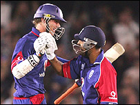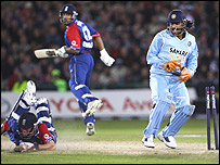 دھونی کے جانے کے بعد یو راج نے کچھ عمدہ شاٹ کھیلے لیکن براڈ نے اپنے دوسرے سپیل میں دو گیندوں کے فرق سے انہیں اور رمیش پوار کو آؤٹ کر دیا۔ جب انگلینڈ نے اننگز شروع کی تو ایلسٹر کُک پہلے ہی اوور میں بولڈ ہوگئے اور جب سکور چودہ پر پہنچا تو انگلینڈ کے دو کھلاڑی پویلین واپس جا چکے تھے۔ وکٹیں کھونے کے باوجود انگلینڈ نے مطلوبہ رن ریٹ برقرار رکھا اور کولنگ وڈ اور پیٹرسن کی شراکت میں چھیالیس رنز بنے۔ تاہم پیٹرسن، آگارکر کی گیند پر چاولہ کے ہاتھوں کیچ ہوگئے۔ اس کے بعد کولنگ وڈ کے رن آؤٹ ہونے سے میچ بھارت کی گرفت میں آ گیا۔ تاہم براڈ اور بوپارہ کے کریز پر آنے کے بعد انگلینڈ کے نقطۂ نظر سے صورتِ حال سنبھل گئی اور بھر پور کوششوں کے باوجود بھی انڈیا کے بالر اس جوڑی کو نہ توڑ سکے۔ |