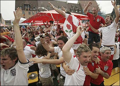 Fan theo dõi từ quảng trường Hauptmarket điên loạn lên vì vui mừng khi Anh cầm chắc vô vòng hai.