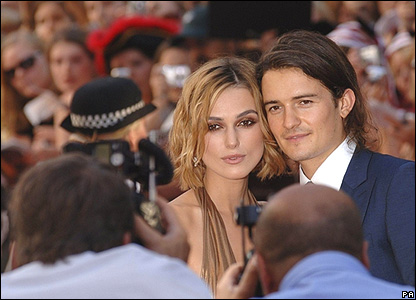 Keira Knightley và bạn diễn Orlando Bloom đứng cho các phó nháy chụp hình