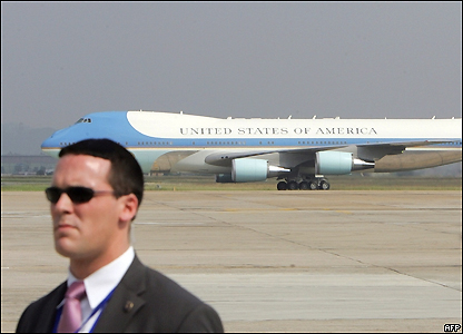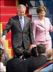 Chiếc Air Force One chở Tổng thống Bush và Đệ nhất phu nhân Laura đáp xuống sân bay Nội Bài lúc 1030 sáng nay 17/11.