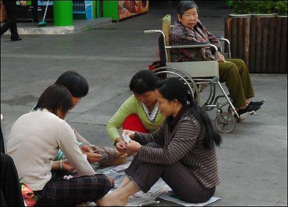 Phụ nữ lớn tuổi và đã có gia đình như chị này ở làng Zili, Kaiping, cũng khó để chuyển nghề nên chỉ còn biết ở nhà làm công việc nội trợ. "Bớt đi công việc đồng áng và có thì giờ chăm sóc con cái cũng tốt nhưng tôi không có thu nhập."