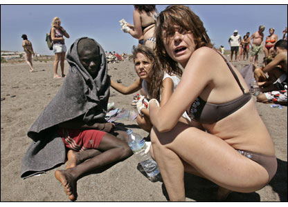 Người trong tin - Giải Nhì: Nhiếp ảnh gia Tây Ban Nha Arturo Rodrigeuz của AP bắt gặp du khách giúp những người di dân mới đổ bộ xuống Tejita, Tenerife.
