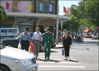 Cô Reiko người Nhật nói "có người giúp mình sang đường thì tốt nhưng nếu có hệ thống đèn báo và mọi người nghiêm chỉnh chấp hành giao thông để mình tự sang thì tốt hơn"