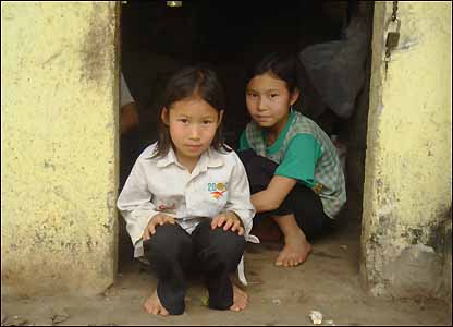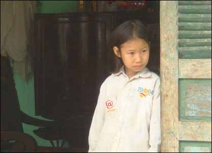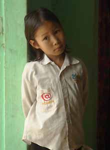 Thấy tôi chụp hình, em rụt rè chạy vào cửa nhà và len lén nhìn.