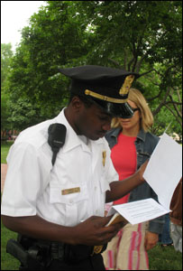 Một nhân viên an ninh kiểm tra giấy phép biểu tình sau khi báo cáo sếp về những gì đang diễn ra tại đây.