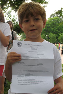 Bé Eli Smulson hãnh diện chìa cho phóng viên BBC xem tờ giấy phép biểu tình. Bé chính là con trai của chị Jennifer Smulson, người lúc trước đã xuất trình cảnh sát tờ giấy phép này.