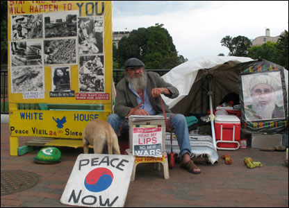 Không chỉ có trẻ em tới biểu tình tại Tòa Bạch Ốc. Người đàn ông này trương một biểu ngữ "Bush là tên khủng bố".