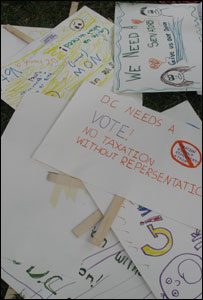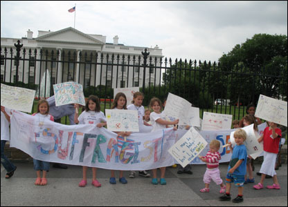 Một nhóm các em nhỏ đứng biểu tình trước Tòa Bạch Ốc. Các em đòi chính phủ và quốc hội hãy để gần 600 ngàn cư dân District of Columbia có đại diện tại Thượng Viện. Toàn bộ 50 bang khác của Hoa Kỳ đều có đại diện tại Thượng Viện, riêng Washington DC thì không.