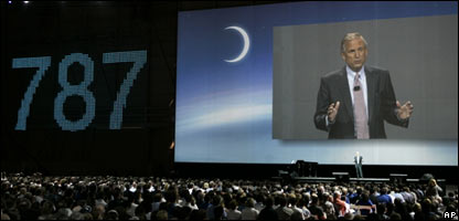 Tổng giám đốc điều hành, Jim McNerney, đã lên sân khấu trước mắt hàng ngàn nhân viên của Boeing và mời các quan chức giới thiệu lọai máy bay mới nhất của hãng mình.