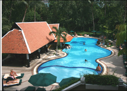 Bể bơi ngoài trời làm khách bớt cái nóng của Bangkok vào tháng này.