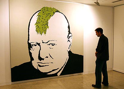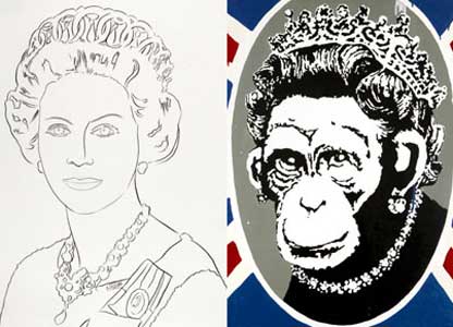 Bức vẽ Nữ hòang Elizabeth của Warhol, dựa vào hình nữ hòang trên đồng tiền mười xu, đặt cùng bức tranh nhại chế độ quân chủ của Banksy.