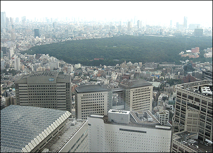 Minh Trị Thần Cung nằm trong công viên xanh như rừng. Nhìn từ trên Observatory của Tòa Đô Sảnh Tokyo thấy cả một rừng cao ốc bao quanh.