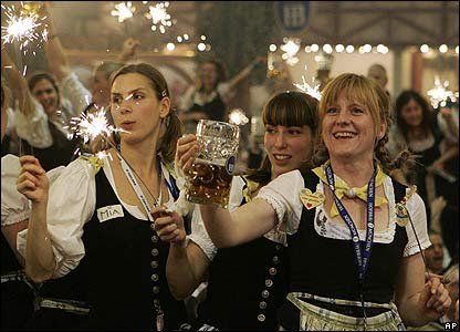 Các cô gái phục vụ đang ăn mừng ngày cuối của lễ hội bia tại miền Nam nước Đức, năm nay có 6,3 triệu người tham gia.