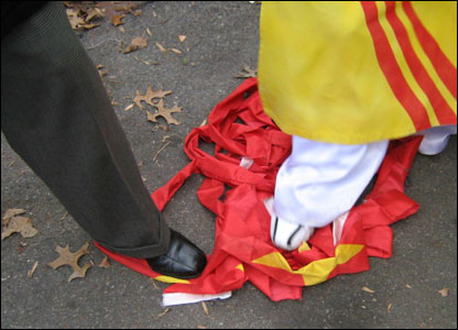Một số biểu tình viên dẫm đạp lên cờ Trung Quốc.
