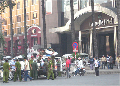 Cảnh sát xuất hiện với số đông để giải tán biểu tình. Một số người đã bị bắt. Ảnh do Trần Đông Đức (Washington DC), Du Hạ (Houston) và Tập hợp Thanh niên Dân chủ (Việt Nam) cung cấp. |