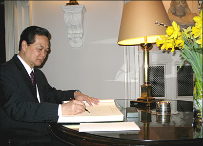 Công việc đầu tiên của ông Dũng khi tới toà Mansion House là ký sổ lưu niệm.