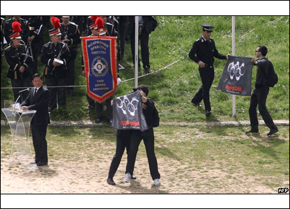 Trong lúc ông Liu Qi (trái), chủ tịch Ủy ban tổ chức Olympic Bắc Kinh, đọc diễn văn thì có hai người chạy ra giăng cờ đen nhưng bị cảnh sát nhanh chóng dẫn đi.