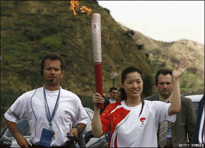 Cây đuốc sau đó được chuyền qua cho vận động viên Trung Quốc, Lou Xuejuan.