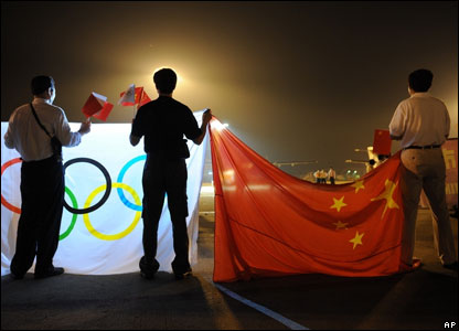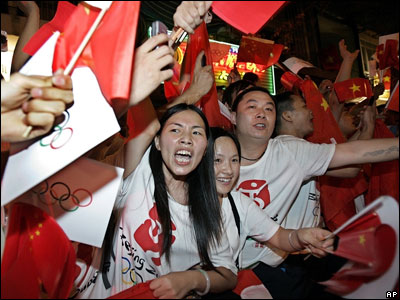 Ủng hộ viên vẫy cờ Trung Quốc tại một điểm dọc đường rước đuốc trước sự quan sát của đông đảo phóng viên nước ngoài.