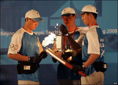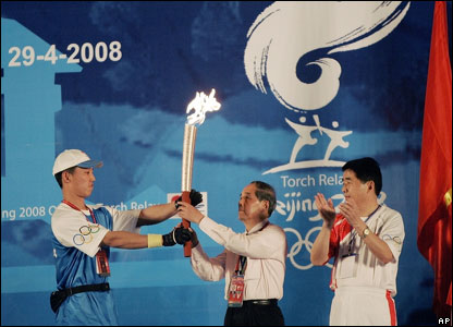 Giới chức Trung Quốc tiếp nhận đuốc từ tay các nhân viên mặc đồ thể thao xanh có nhiệm vụ bảo vệ cho ngọn lửa Olympics.