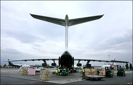 Chiếc máy bay vận tải này đang được chất hàng cứu trợ khẩn cấp tại Pháp để chuyển sang Miến Điện.