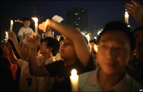 Các lễ tưởng niệm nghiêm trang tiếp tục cả trong đêm, như buổi lễ thắp nến cầu nguyện này tại Thành Đô. |