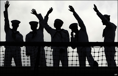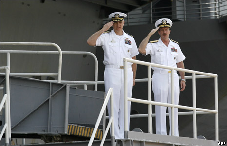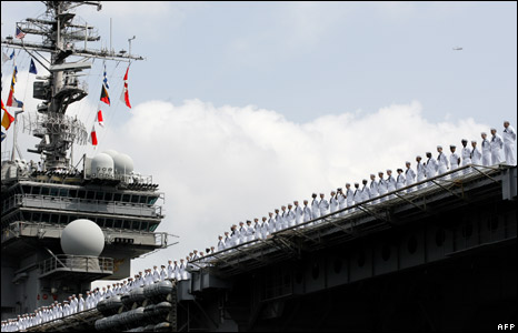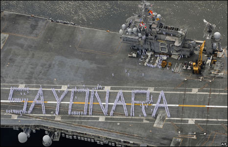 Giây phút chia tay, thủy thủ đoàn trên Kitty Hawk xếp hình chữ "sayonara" (tiếng Nhật là Tạm biệt) trên boong tàu.