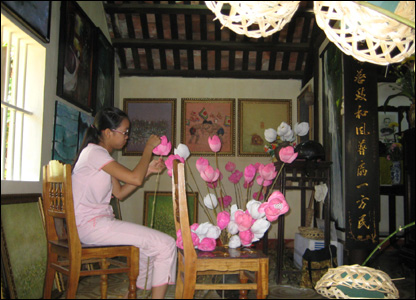 Những cánh sen hồng, làm bằng nguyên liệu giấy từ làng nghề thủ công Thanh Tiên đang được kết để trang trí cho ngày hội.