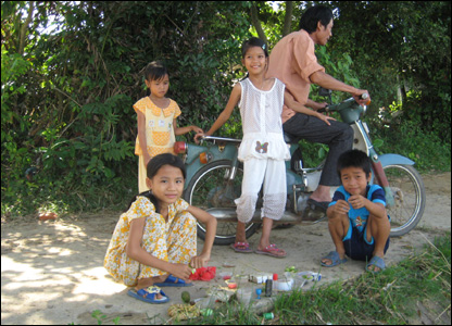 Ở một ngã ba đường làng, các cô bé cậu bé cũng mở hội riêng. Không gì vui bằng trò chơi đồ hàng.